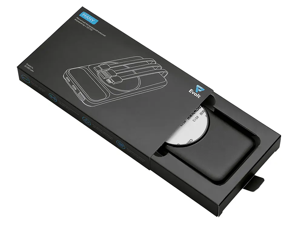 Магнитный беспроводной внешний аккумулятор со встроенными кабелями «Мэни», 10000 мАч
