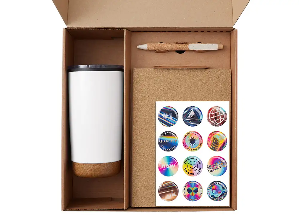 блокнот — пробка, картон, переработанная бумага, ручка — пробка, пластик, дерево, стикеры — смола, коробка — картон