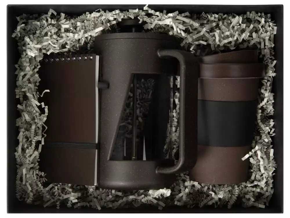 | Материал товара | френч-пресс- боросиликатное стекло, нержавеющая сталь 304 марки, 85% ПП пластик, 9% древесные волокна, 6% кофейный жмых, стакан- 60% кофейный жмых, 20% кукурузный крахмал, 20% полимеры, блокнот- пластик, переработанная бумага |